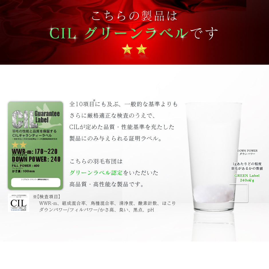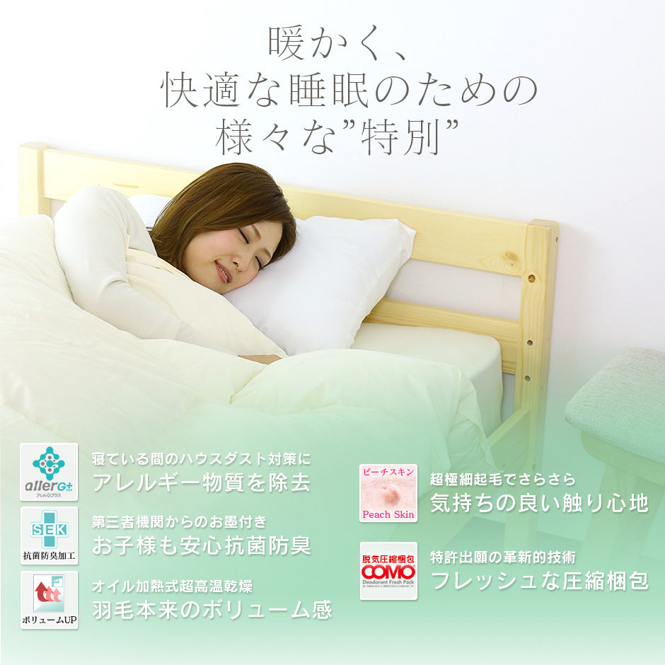 羽毛原料にはすべてスチームパワーアップ加工、アレルG+加工が施されています。