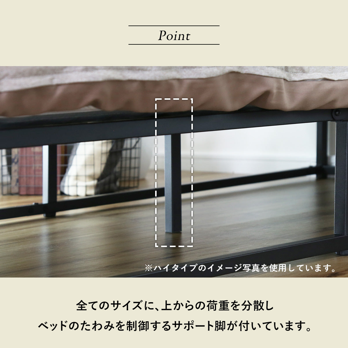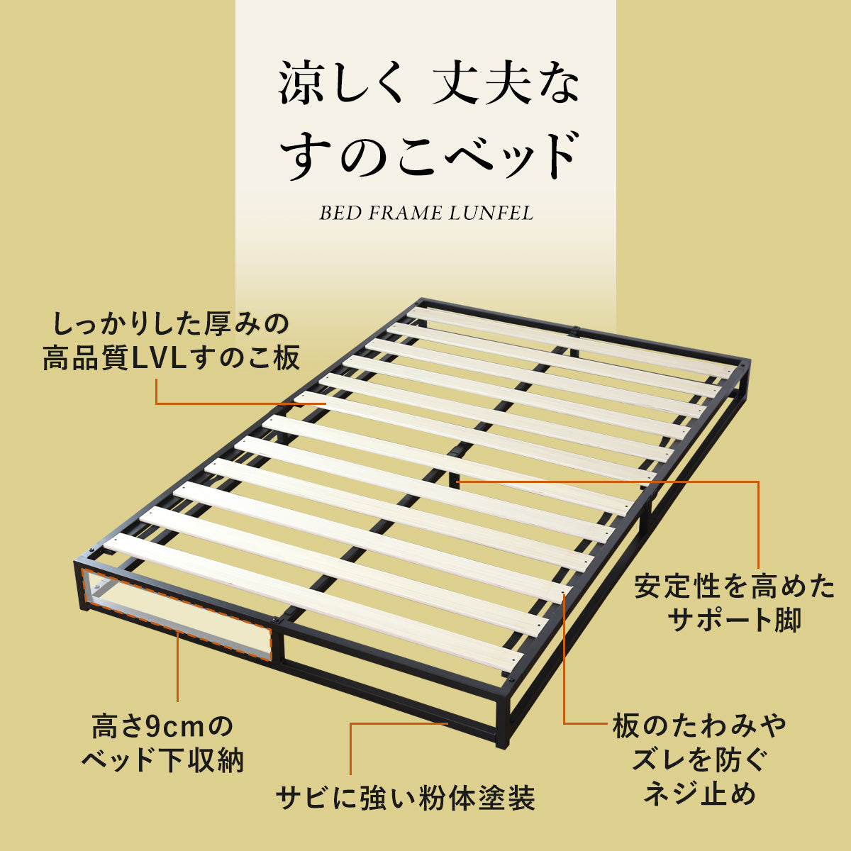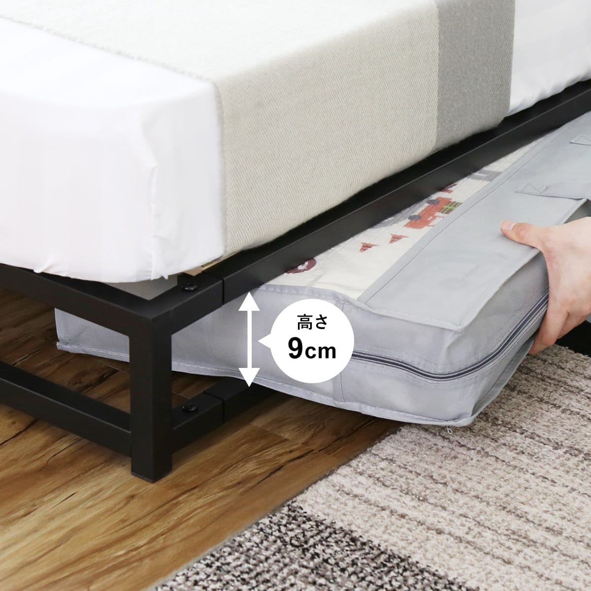 高さ9cmのベッド下には収納ボックスや衣装ケースを置いたり、収納スペースとして有効活用が出来ます。