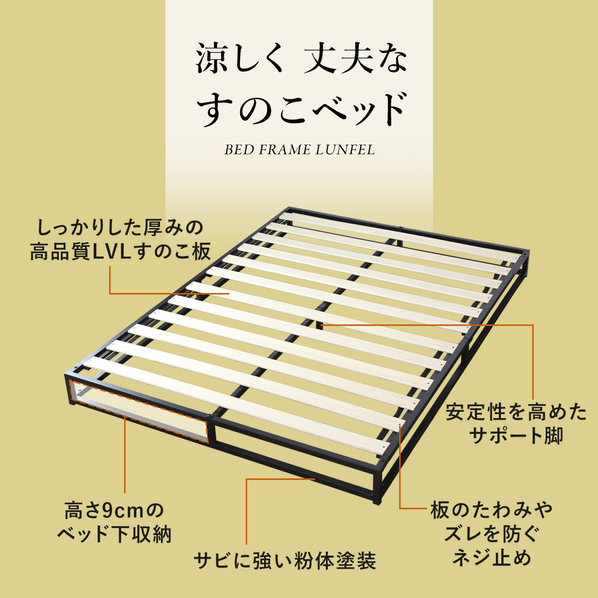 高さ9cmのベッド下には収納ボックスや衣装ケースを置いたり、収納スペースとして有効活用が出来ます。