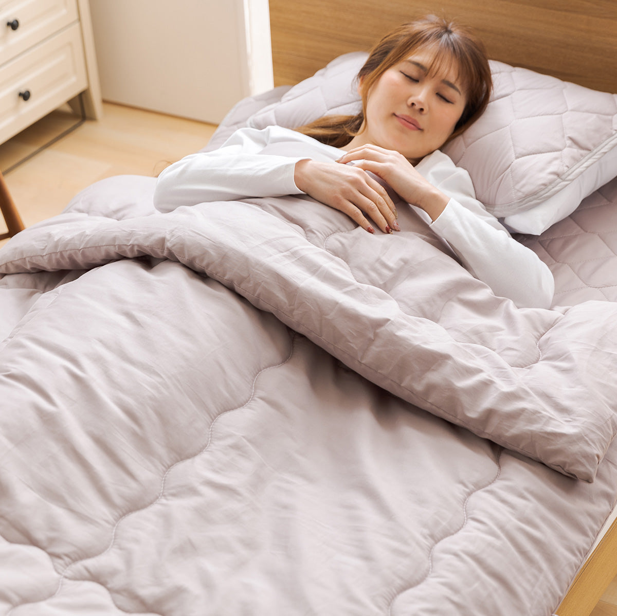 天然素材の綿を100%使用しているので、通気性・吸水性に優れサラサラとした状態を保ちます。ちょうどいい薄さなので寝苦しくなく、キルト加工で寝返りを打っても体にフィットしてくれます。