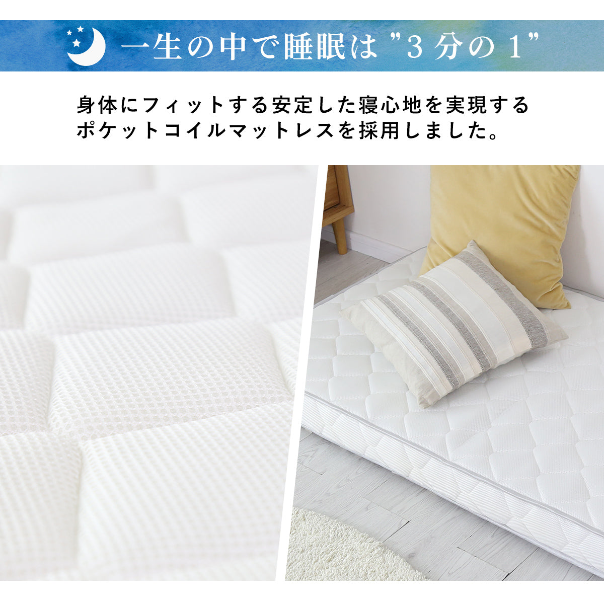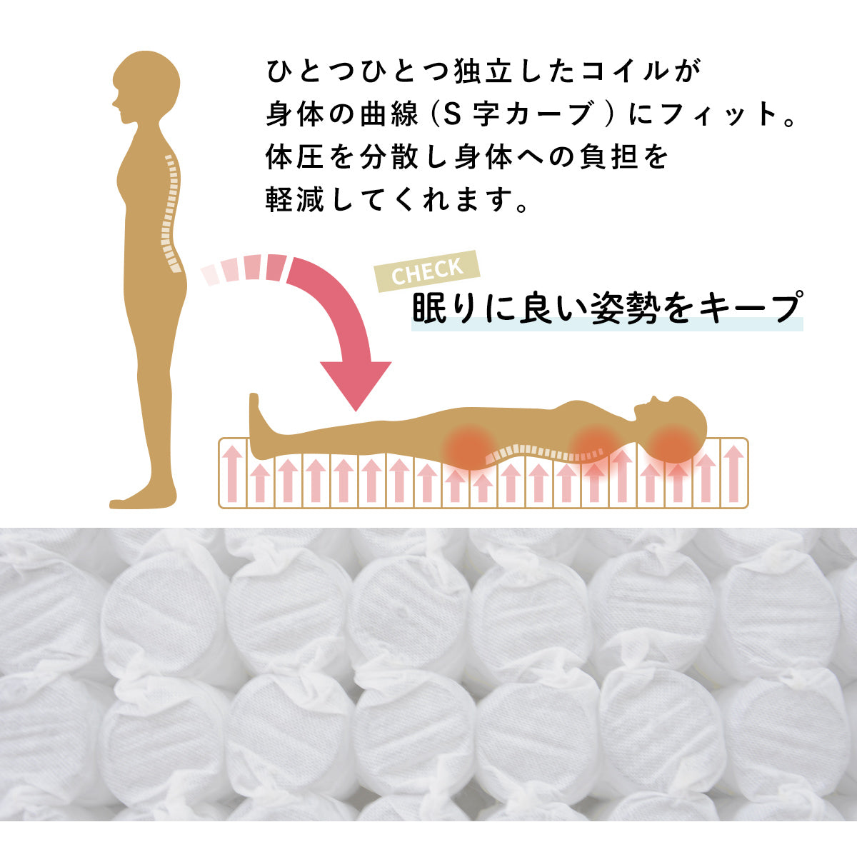 ポケットコイルマットレスは、立っている状態とS字カーブをキープしたまま身体をしっかり支えてくれるので快適な眠りに導いてくれます。