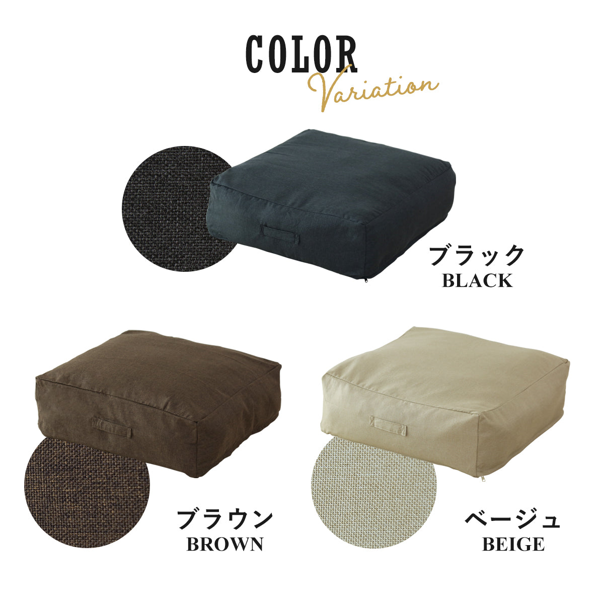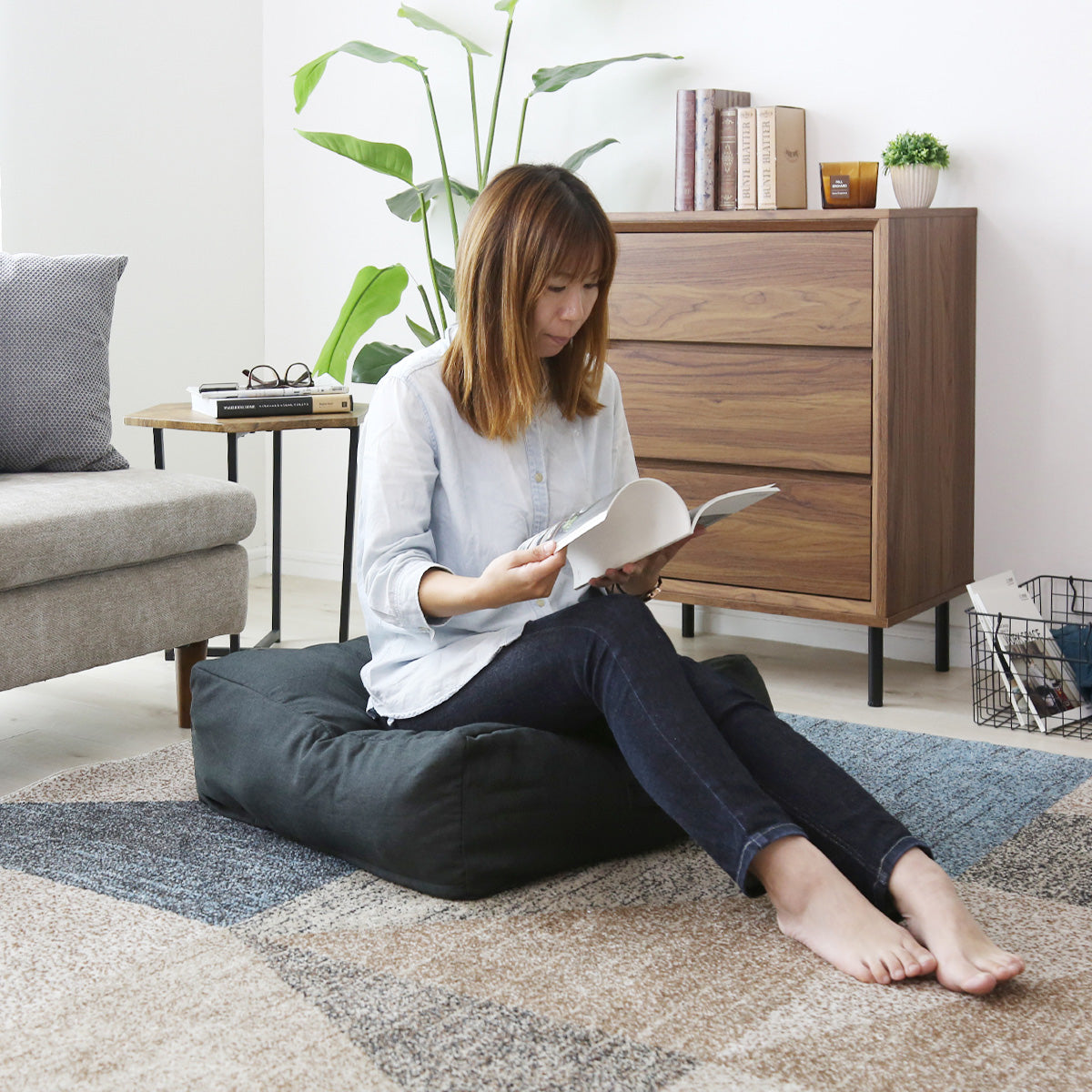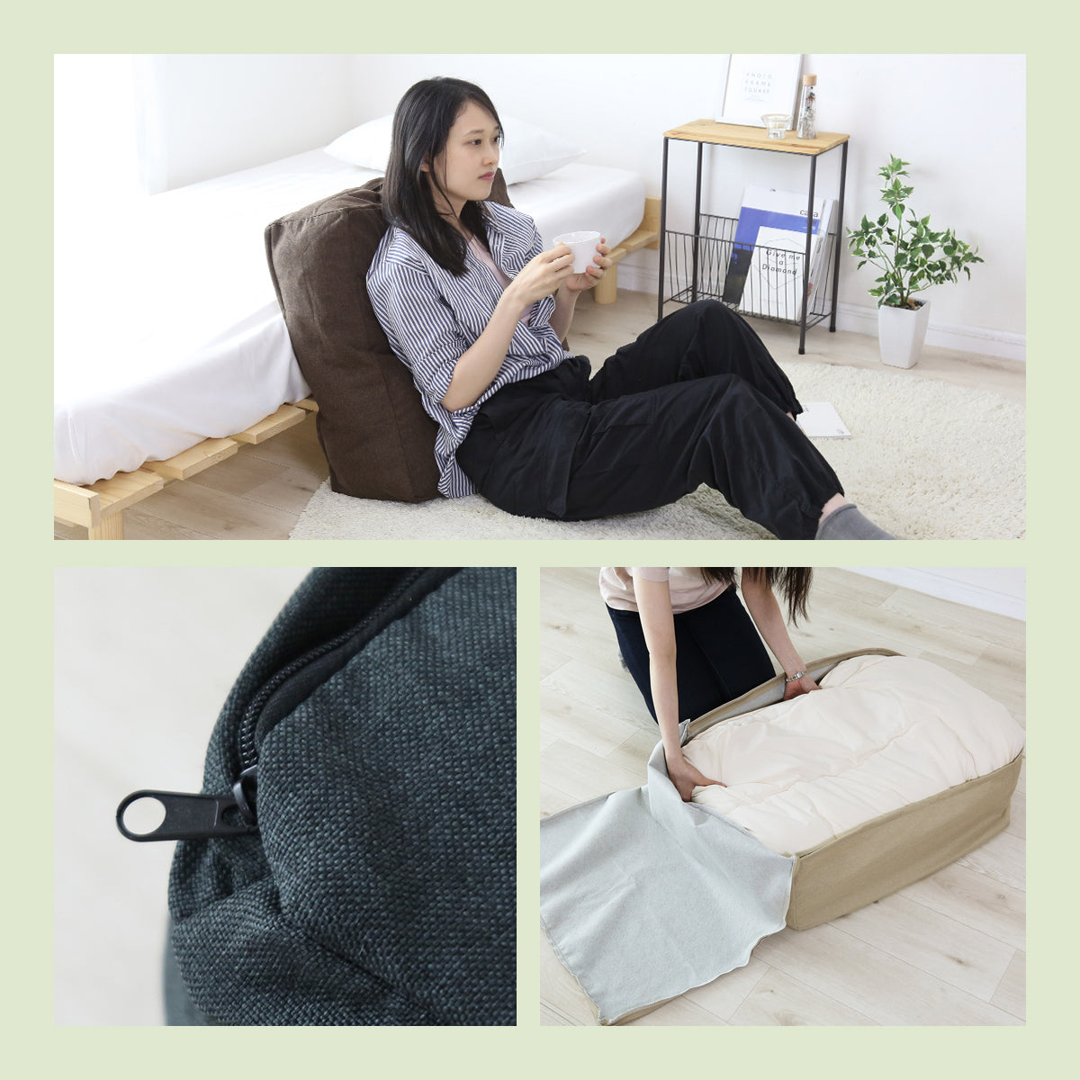 スクエア型のシルエットは様々な姿勢にフィットしやすく、壁に付けて背もたれクッションとしてもご使用いただけます。床置き、ごろ寝、ソファやベッドの上など、どこに置いても使いやすくどんな体勢でも自由に寛げます。