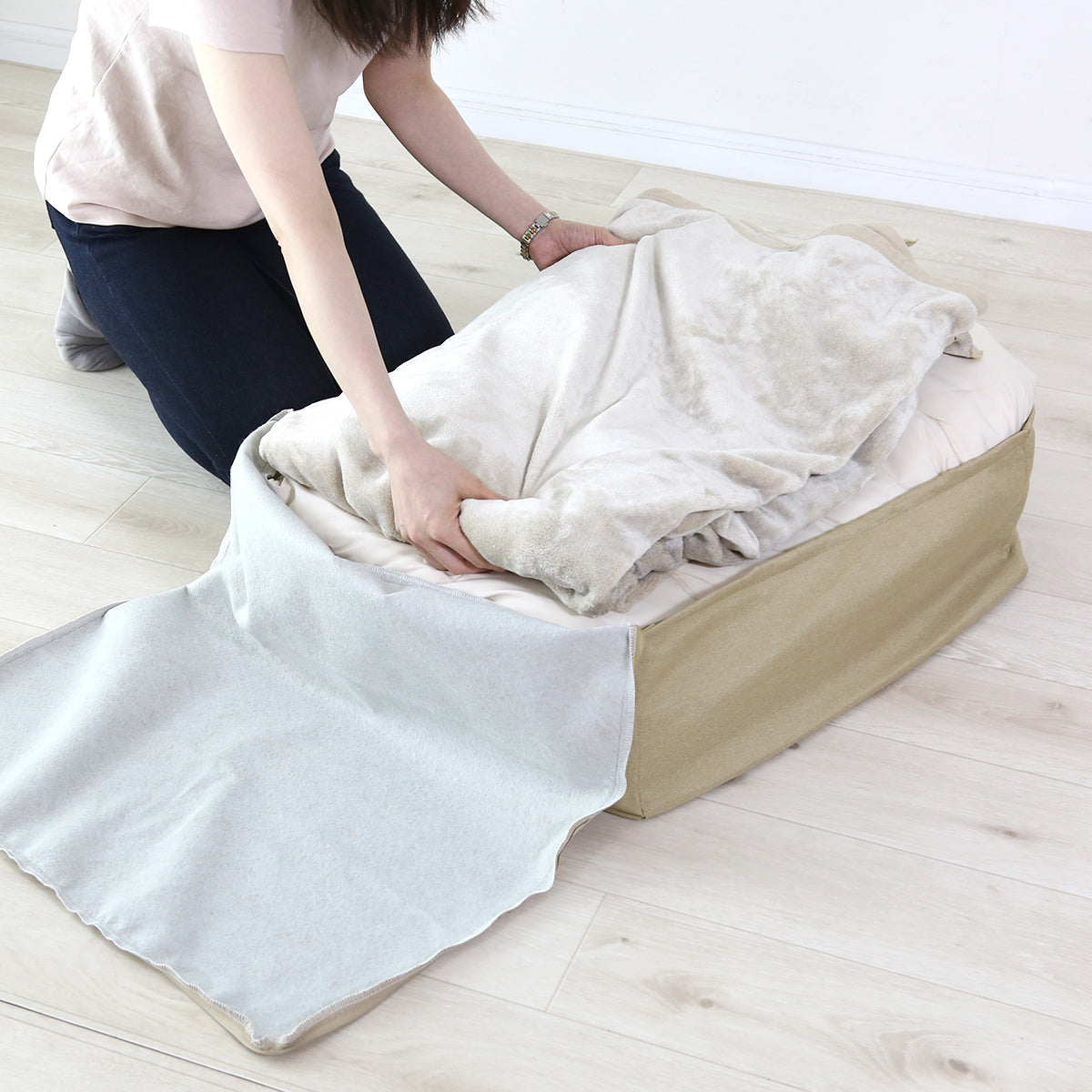 布団は必要な時にすぐに取り出せるよう、大きくガバっと開くコの字型ファスナーを採用。布団を圧縮する手間もなく、たたんで入れるだけの超簡単仕様です。シングルサイズの掛布団1枚と毛布1枚を同時に収納できる大容量設計。こたつ布団の収納にも適しており、季節の変わり目に行うお布団の衣替え時にも大活躍すること間違いなし!